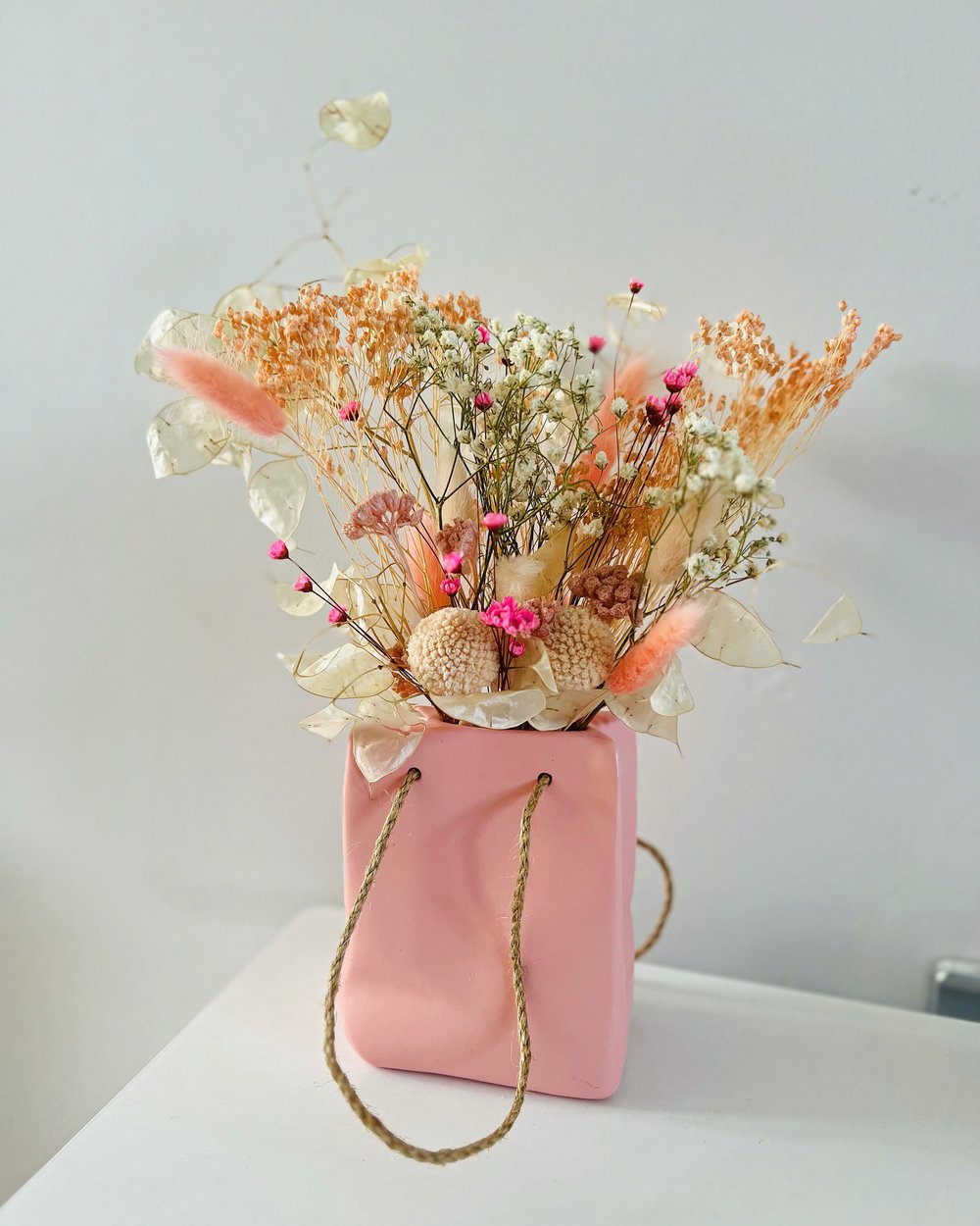 How beautiful and cute are these Vase flowers. Bespoke Handbag vase with a Bloom of flowers arranged.